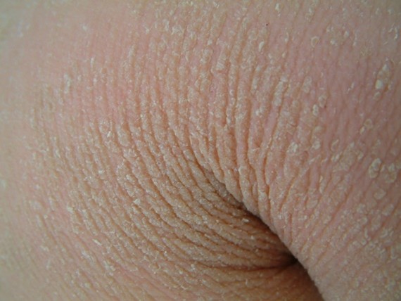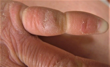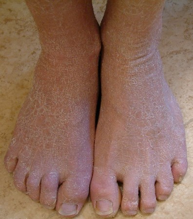 Hudsymtomen märks direkt efter födelsen oftast genom att barnet har en kraftig hudrodnad, fjällning och torrhet. De flesta är födda någon eller några veckor för tidigt. Graden av hudförändringar varierar mellan olika personer. Huden har en annorlunda struktur framför allt i hudvecken, på nacken och på händerna (se foto). Ansiktet är oftast sparat dvs. har en normal eller nästan normal hud. Klådan är ofta mycket besvärande.